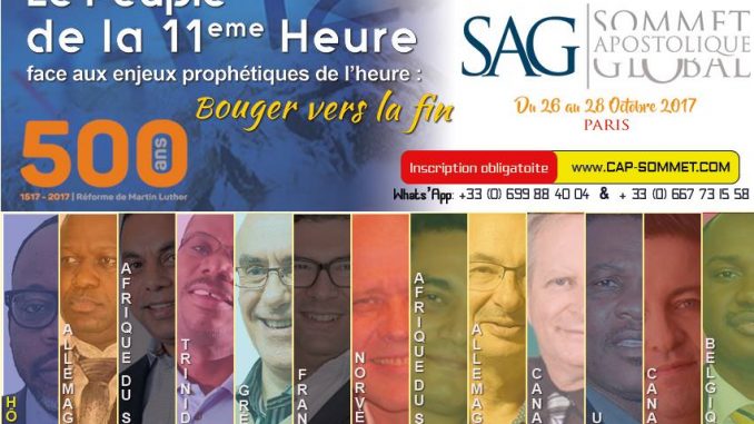 L’édition 2017 du Sommet Apostolique Global (S.A.G.) se déroulera en deux parties, du 23 au 29 octobre, à Paris. De nombreux orateurs internationaux participeront à ce rendez-vous majeur pour le Réveil de la France, sur le thème : “Bouger vers la Fin !”