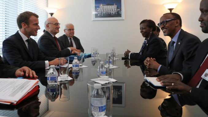 Le président français Emmanuel Macron, en compagnie de son homologue rwandais Paul Kagame, le 25 septembre 2018 à New York. A droite du chef de l’Etat du Rwanda, sa ministre des Affaires étrangères Louise Mushikiwabo.